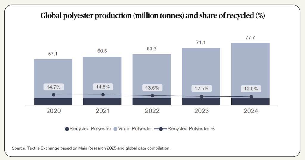 More than 110 companies including Adidas, Patagonia and Nike pledged through the Textile Exchange’s Polyester Challenge to use only recycled sources of polyester by the end of 2025. Only 26 percent have met that goal.