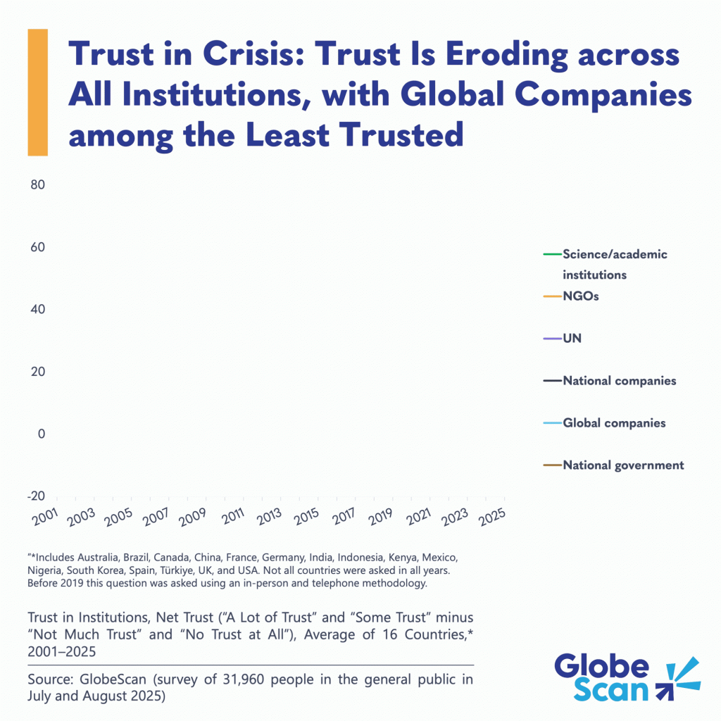 Trellis data partner GlobeScan’s long-running public opinion tracking reveals public trust is eroding across major institutions, with global companies, NGOs and government entities facing declines. Trust in national governments is approaching a historic low after peaking briefly during the pandemic. Other institutions such as science/academia and the United Nations have all seen net trust (trust minus distrust) fall, in some cases quite sharply.