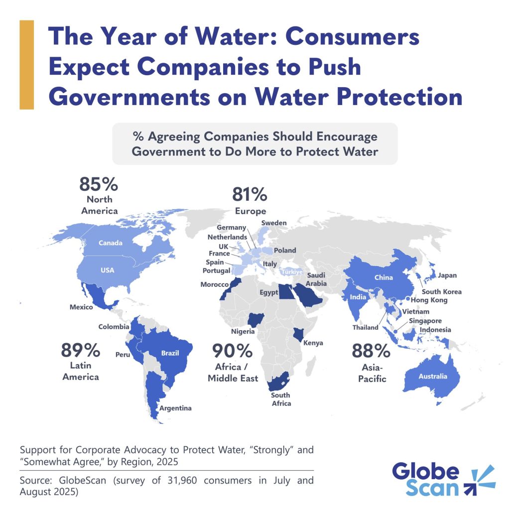 In Europe and North America, agreement is strong but slightly less intense. This pattern aligns with broader GlobeScan findings showing that consumers in higher-income markets may feel more buffered by infrastructure, regulation or distance from water stress, even while acknowledging its importance.