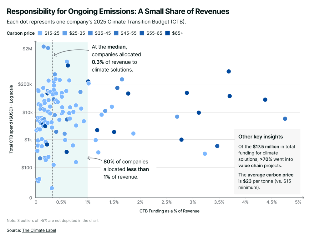 Last year, 96 percent of the 128 companies that earned the certification exceeded the minimum CTB of $15. Even counting companies that far exceeded the $15 per tonne level, median climate transition funding equaled just 0.3 percent of revenues, and 8 out of 10 brands met the CTB minimum for less than 1 percent of revenues.