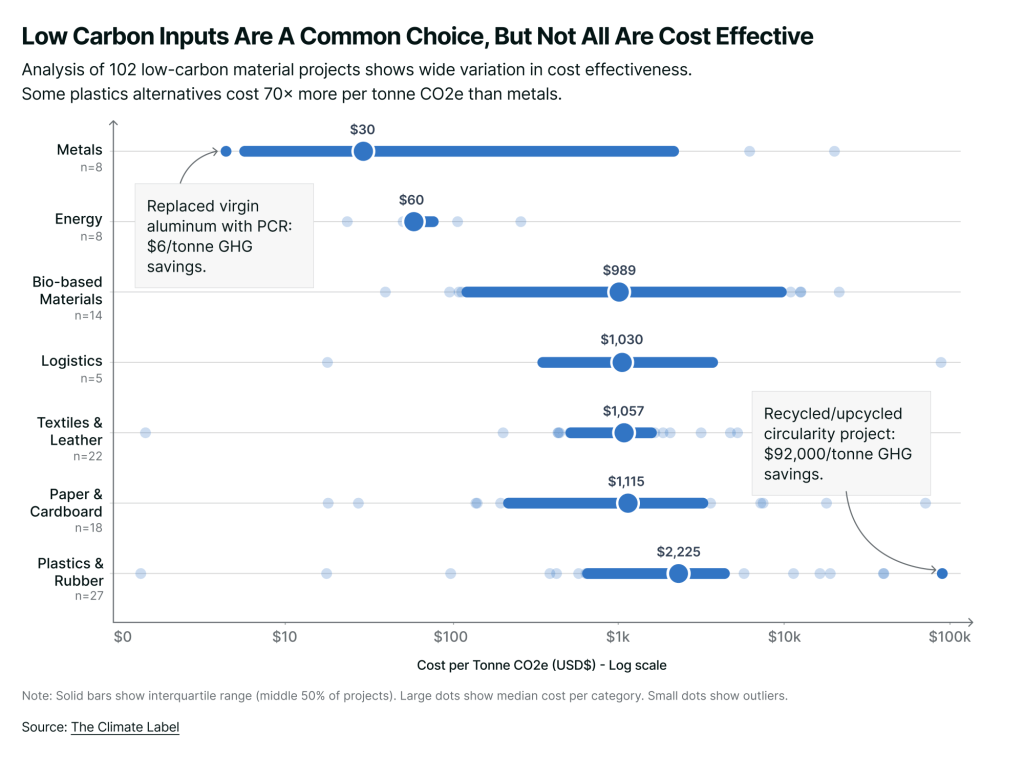 Despite a clear preference for low-carbon materials, it’s not clear that companies prioritize them based on their cost effectiveness. To document these initiatives, companies reported the estimated GHG savings of each initiative they invested in, along with price premiums. Costs per tonne ranged widely — from a few dollars per tonne to tens of thousands of dollars. Lower carbon metals and direct energy switching offered the most cost effective reductions, whereas lower carbon plastics and rubber offered the least cost effective reductions.