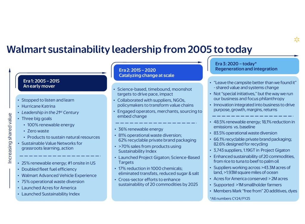 Walmart views its sustainability journey through three distinct eras. Source: Walmart