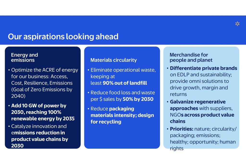 Still, she added: “Walmart is not a sustainable company. They’re falling behind in their operational goals. And they’ve always had a big challenge and needed to do so much more on product sustainability and their supply chain.”