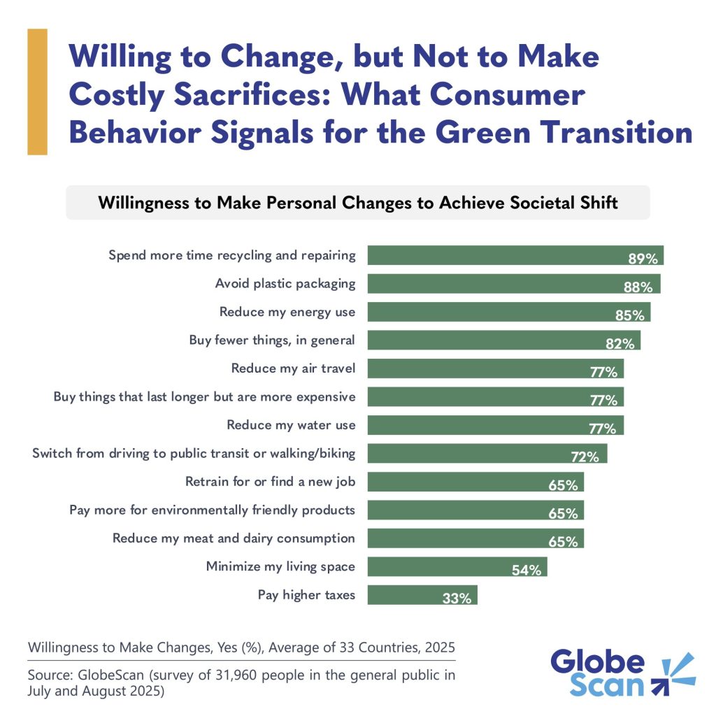 GlobeScan’s research shows that while people broadly support the green transition, their willingness to make hard personal sacrifices, especially financial ones, is limited. Instead, people prefer actions that feel familiar and relatively effortless. This signals a clear imperative: make sustainability frictionless. To accelerate the transition, governments and businesses must embed low-effort, high-impact actions into everyday life and design systems that reward sustainable choices without demanding sacrifice.