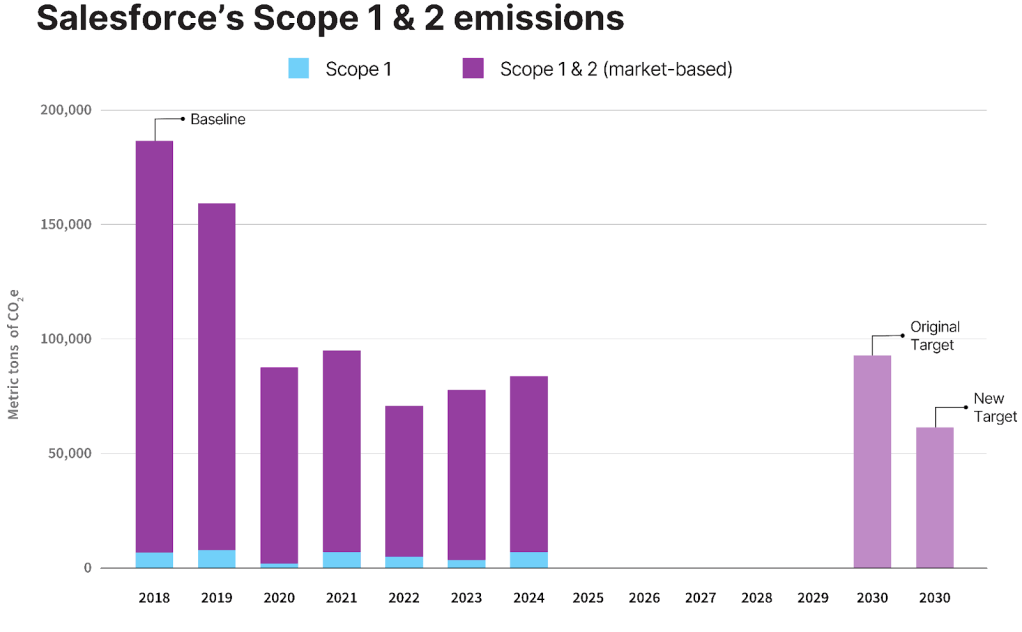 Its initial plan, validated by Science Based Targets initiative (SBTi) four years later, called for halving emissions from operations and electricity use (Scopes 1 and 2) by 2030 — a commitment Salesforce achieved several years early thanks to investments in renewables. Subsequently, it has upgraded to a more ambitious 2030 target for Scope 1 and 2.