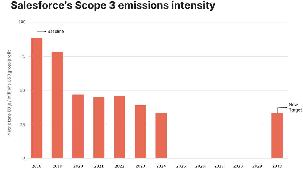 - Salesforce’s new target is based on cutting emissions per unit of profit, rather than absolute emissions.