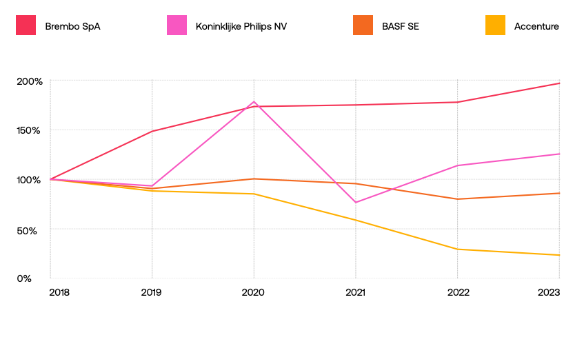 Using footprints from 2018 as a starting point, the group plotted percentages changes over the following five years. In the case of tech company Philips, total emissions came close to doubling one year before dropping back below baseline 12 months later.