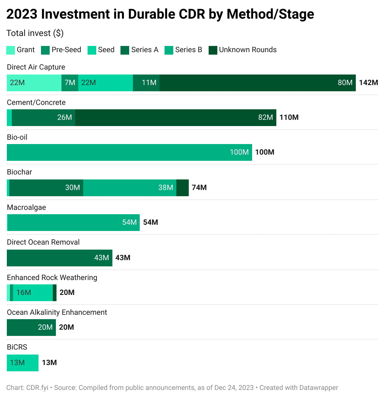 Despite the low price and co-benefits, CDR.fyi data shows that biochar projects attracted just $74m in investment in 2023, around half the figure for DAC. That may in part be due to concerns about the fate of the carbon in biochar. Many organizations, including CDR.fyi, classify biochar as a “durable” removal method, but there’s no fixed definition for what that means.