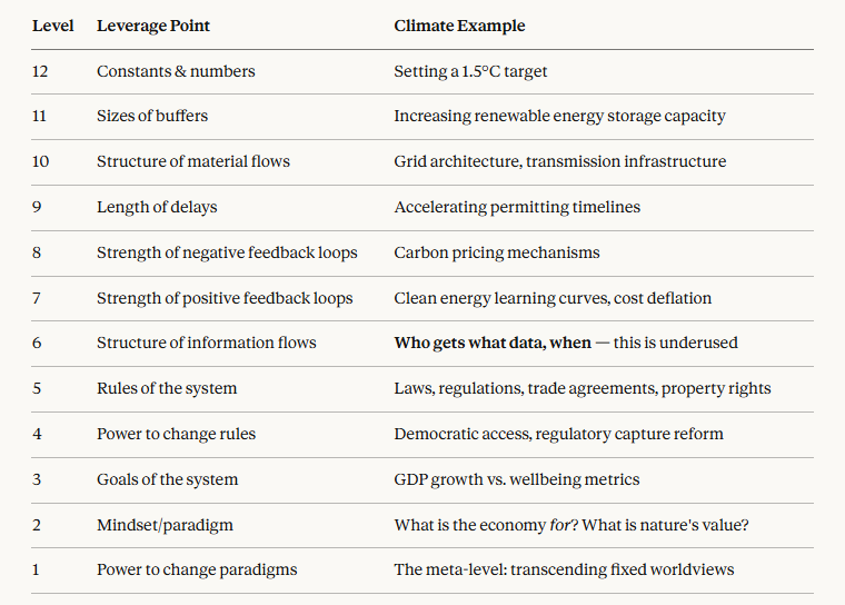 - Information structure. Not just what data exists, but who gets it, when, and in what form. This is Level 6 on Meadows’ hierarchy and it’s dramatically underused in climate strategy. Carbon disclosure requirements, mandatory Scope 3 emissions reporting, real-time climate risk embedded in investment platforms don’t just inform decisions, they restructure incentives. The reason ESG frameworks moved more institutional capital in the last five years than voluntary pledges moved in two is that they changed information architecture, not just sentiment.