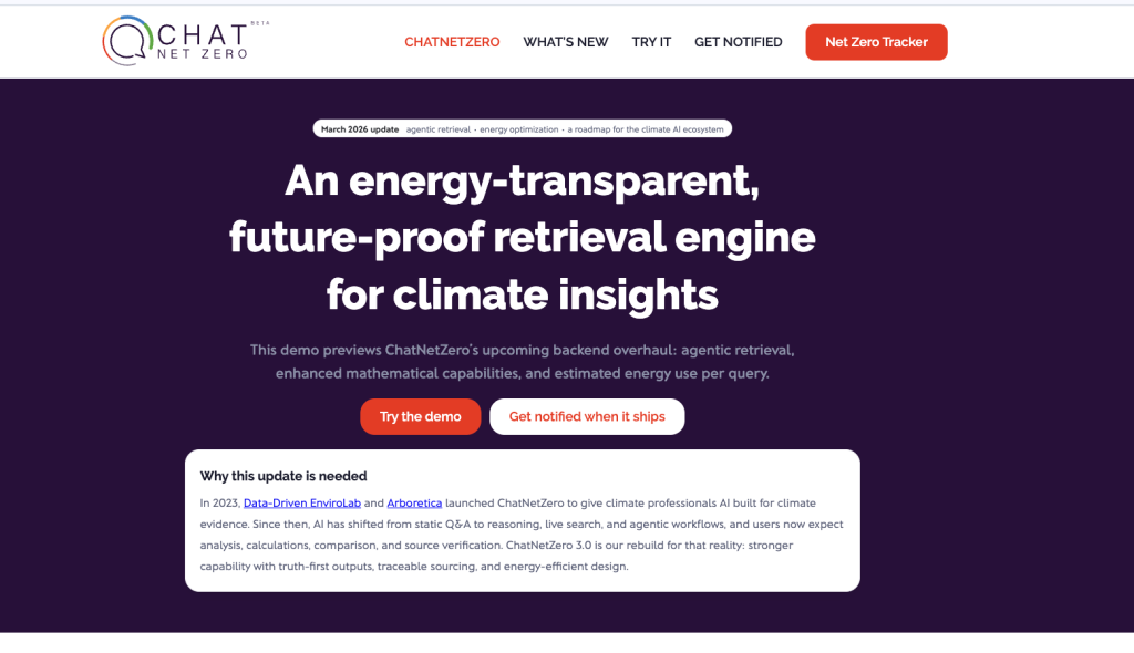 The tool, first introduced in October 2023, was developed by the research groups that publish the widely used Net Zero Tracker, along with the Data-Driven Envirolab at the University of North Carolina at Chapel Hill and tech company Arboretica.