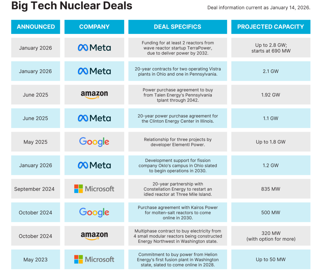 - Amazon, Google, Meta and Microsoft have publicly contracted for at least 13 gigawatts of nuclear energy and invested in advanced startups.
