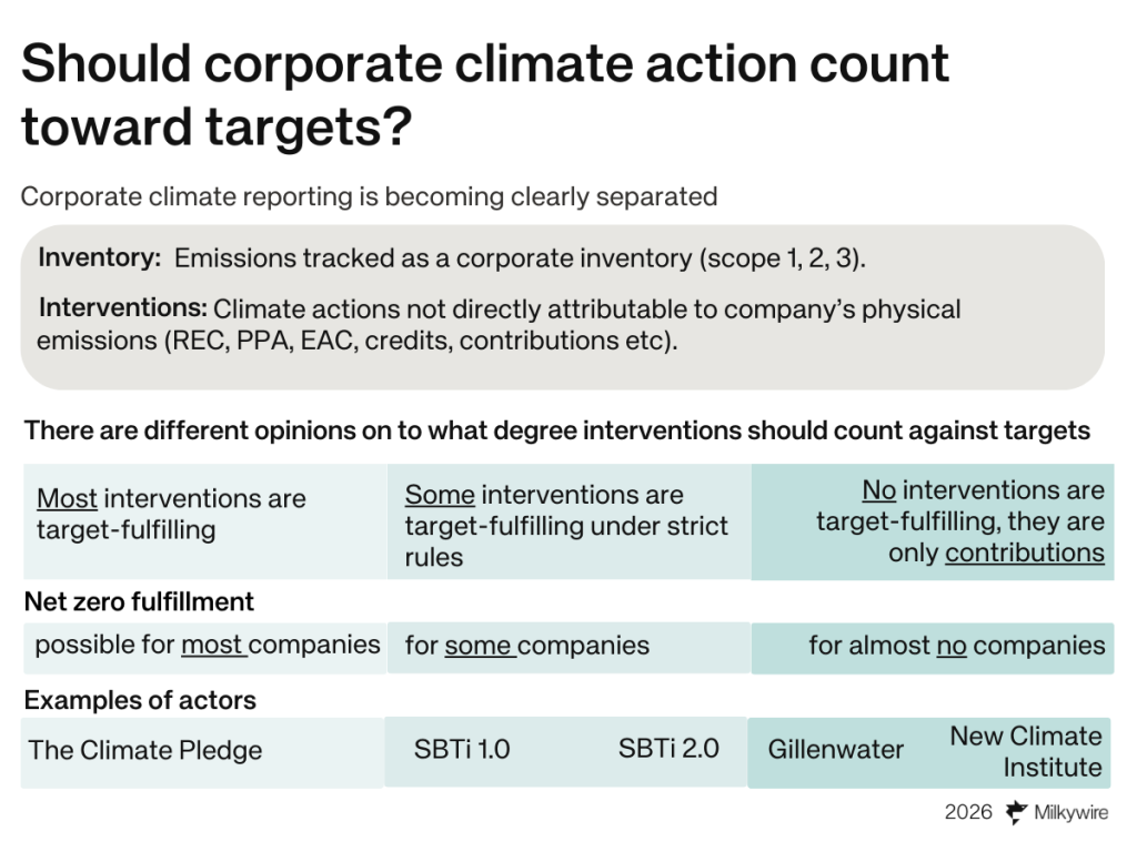 - Corporate climate reporting is shifting to separate emission inventories from corporate interventions, making target fulfillment a more complex question.